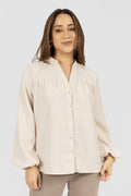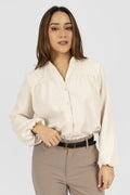 Las mangas terminan con un delicado detalle abullonado cerca de la muñeca, que aporta un toque femenino y sofisticado. Confeccionada en una tela ligera y fresca, es perfecta para mantenerte cómoda durante todo el día sin perder el estilo.