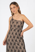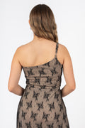 Tiene el detalle del hombro asimétrico, para darle un toque modelo al vestido. Elaborado en encaje con forro incluido, te hará lucir un estilo elegante y sobrio. Ademas, su silueta con corte sirena resaltara tu figura. Lleva cierre invisible y reguladores en las tiras para mayor comodidad.